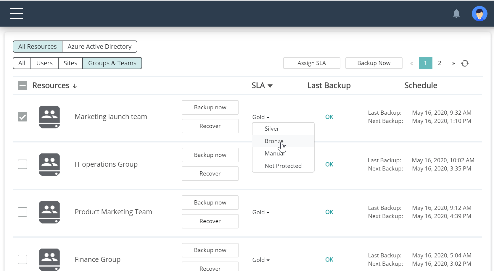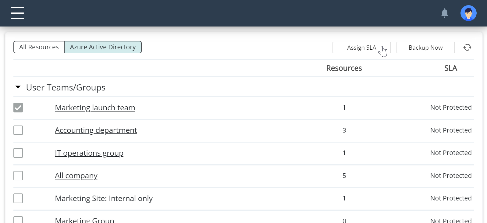 - Select a teams in the Groups/Teams resource view, and assign a backup SLA policy to it.