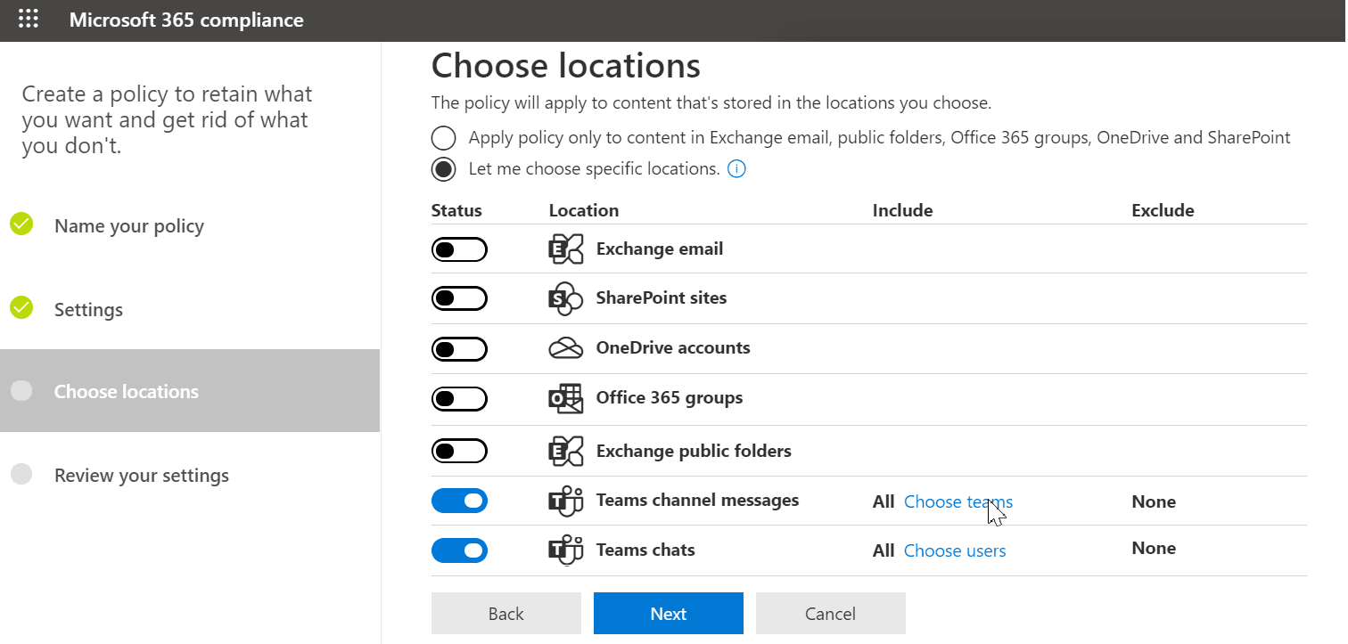 Selected team's resources will be automatically backed up - including messages & data on team's SharePoint